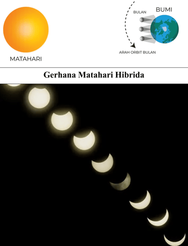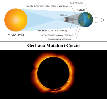 Terjadi ketika Bulan berada pada titik terjauhnya dari Bumi (apogee). Karena jaraknya lebih jauh, Bulan tampak lebih kecil dan tidak bisa menutupi seluruh piringan Matahari. Sisa cahaya Matahari akan terlihat seperti "cincin api" (annulus) di sekeliling bayangan gelap Bulan.