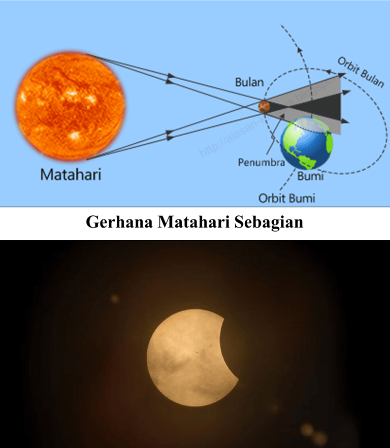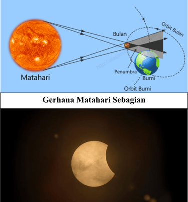 Terjadi ketika Bulan, Bumi, dan Matahari tidak sejajar sempurna. Bulan hanya menutupi sebagian piringan Matahari. Pengamat yang berada di area penumbra akan melihat Matahari seolah-olah "tergigit".