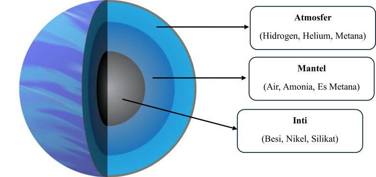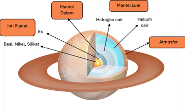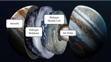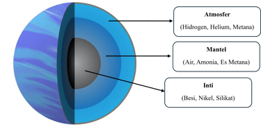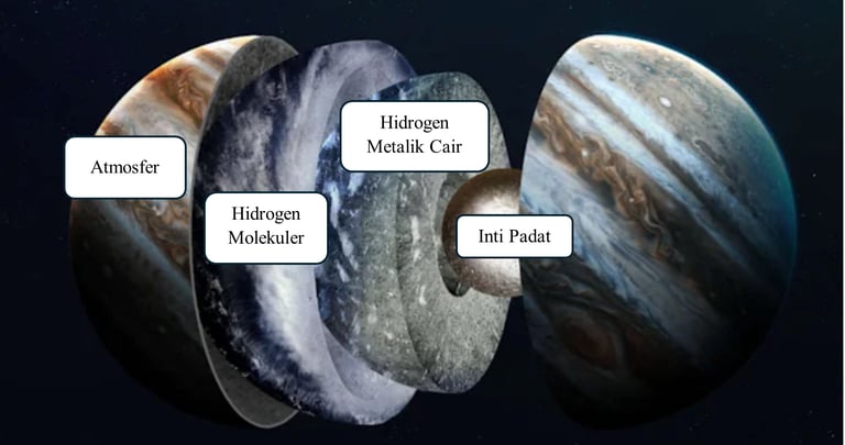 Atmosfer (Lapisan Gas): Bagian terluar yang kita lihat, terdiri dari gas hidrogen dan helium dengan awan amonia, hidrosulfida, dan air yang membentuk pita-pita badai horizontal.