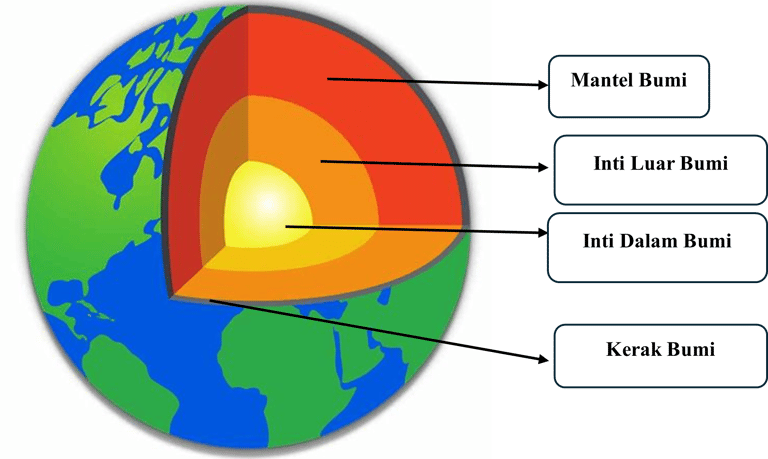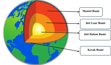 Inti Dalam (Inner Core): Pusat Bumi yang berbentuk bola padat sangat panas, terutama terdiri dari besi.