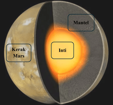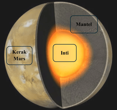 Inti (Core): Terdiri dari besi, nikel, dan sulfur. Berbeda dengan Bumi, inti Mars diperkirakan tidak aktif (padat atau tidak berputar dengan kuat), sehingga Mars kehilangan medan magnet globalnya.