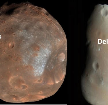 Deimos: Satelit yang lebih kecil dan berada di orbit yang lebih jauh.