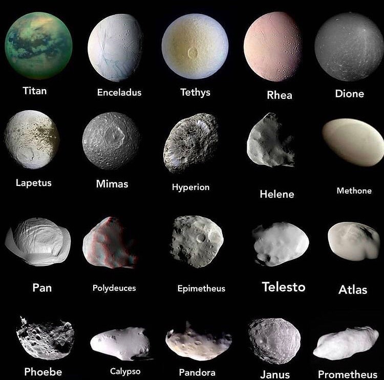 Saturnus saat ini memiliki 146 satelit alami yang telah dikonfirmasi (jumlah ini bisa terus bertambah seiring berkembangnya teknologi teleskop). Satelit Paling Terkenal: