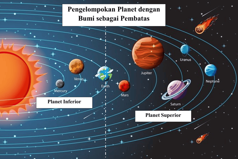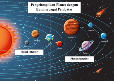 Planet Inferior: Ini adalah planet-planet yang orbitnya berada di dalam orbit Bumi (berada di antara Matahari dan Bumi). Karena posisinya ini, planet inferior bisa mengalami fase sabit atau purnama jika dilihat dari Bumi (mirip seperti Bulan).