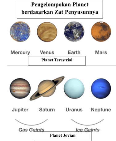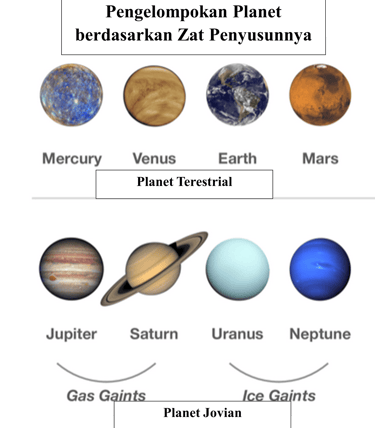 Raksasa Gas (Gas Giants): Didominasi oleh gas hidrogen dan helium. (Anggota: Jupiter dan Saturnus)